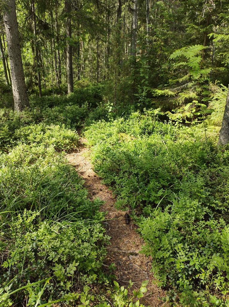 Meillä on mökillä pieni pätkä vanhaa polun pohjaa. Ennen näitä mökkitonttien lohkomisia joskus 60- luvulla kulki polku ehjänä ja katkotta pitkin järven rantaa, kiersi koukaten suon ja jatkoi edelleen seuraavalle järvelle. Polun synnyn rantaviivaa seuraten voinee ajoittaa 1800- luvun lopulle, jolloin tämä ’meidän’ järvi patoamalla syntyi nykyiseen paikkaansa. Vanhemmat luonnon järvet täällä kantavat saamelaisvaikutteisia vanhoja nimiä, mutta tämä historian mittakaavassa hiljattain tehty sai nimekseen Ruhkalammi. Nimi kuvannee padon tukkikourun muodostamaa tukkiruuhkaa lammella. Väylä oli aikoinaan merkittävä tukinuittoreitti Isojärven maisemien vesijaosta länteen päin. Taisivat varsinaisia ruuhkavuosia olla sodan jälkeiset suursavotat, joilla jätkät nostivat maan taloutta pystyyn. Seudun viimeinen kämppäkin on lopettanut asiahommat vasta 60- luvun alkuvuosina.