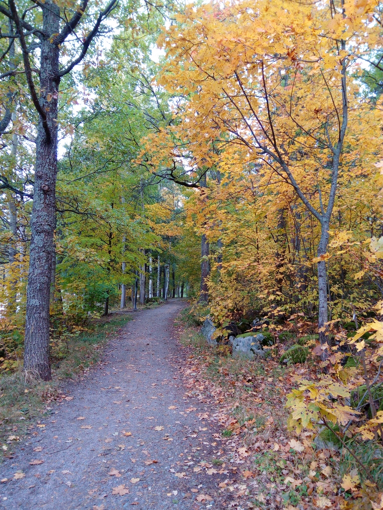 Vasemmalla: Syksyn väriloistoa. Tämä on ainoa tai ainakin ensimmäinen kuva, jonka värejä olen blogiin säätänyt kuvankäsittelyllä. Näkymä ruudulla vastaa silmän näkemää. Puhelimen kamera haalensi värejä.